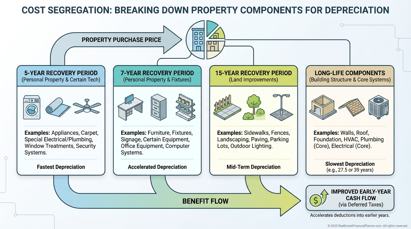 This engineering-based analysis breaks the property into components with shorter depreciation lives, typically five, seven, or fifteen years.