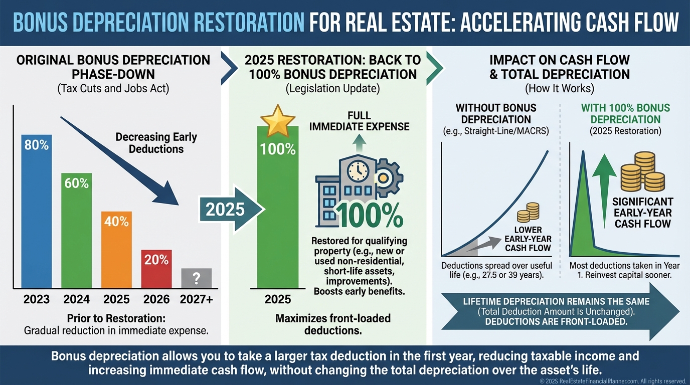 Beginning in 2025, bonus depreciation was restored to one hundred percent for qualifying property, dramatically extending its relevance for real estate investors who plan properly.