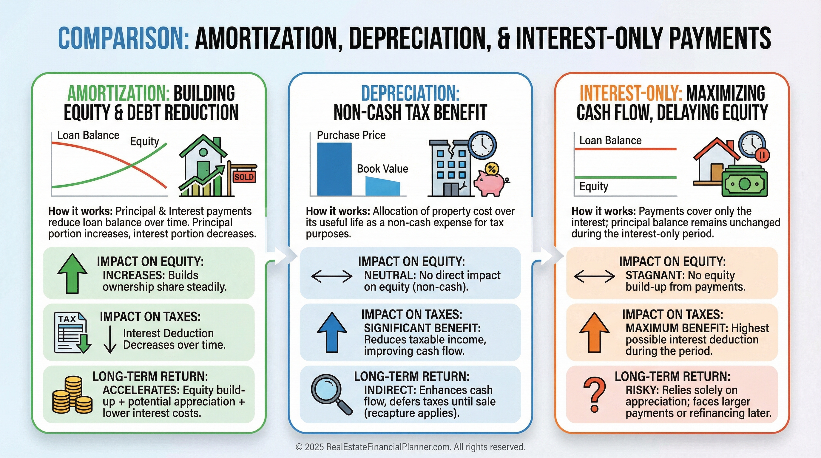 Amortization builds equity. Depreciation reduces taxable income. Interest-only loans improve cash flow but create no equity through paydown. Partially amortizing loans introduce balloon risks.
