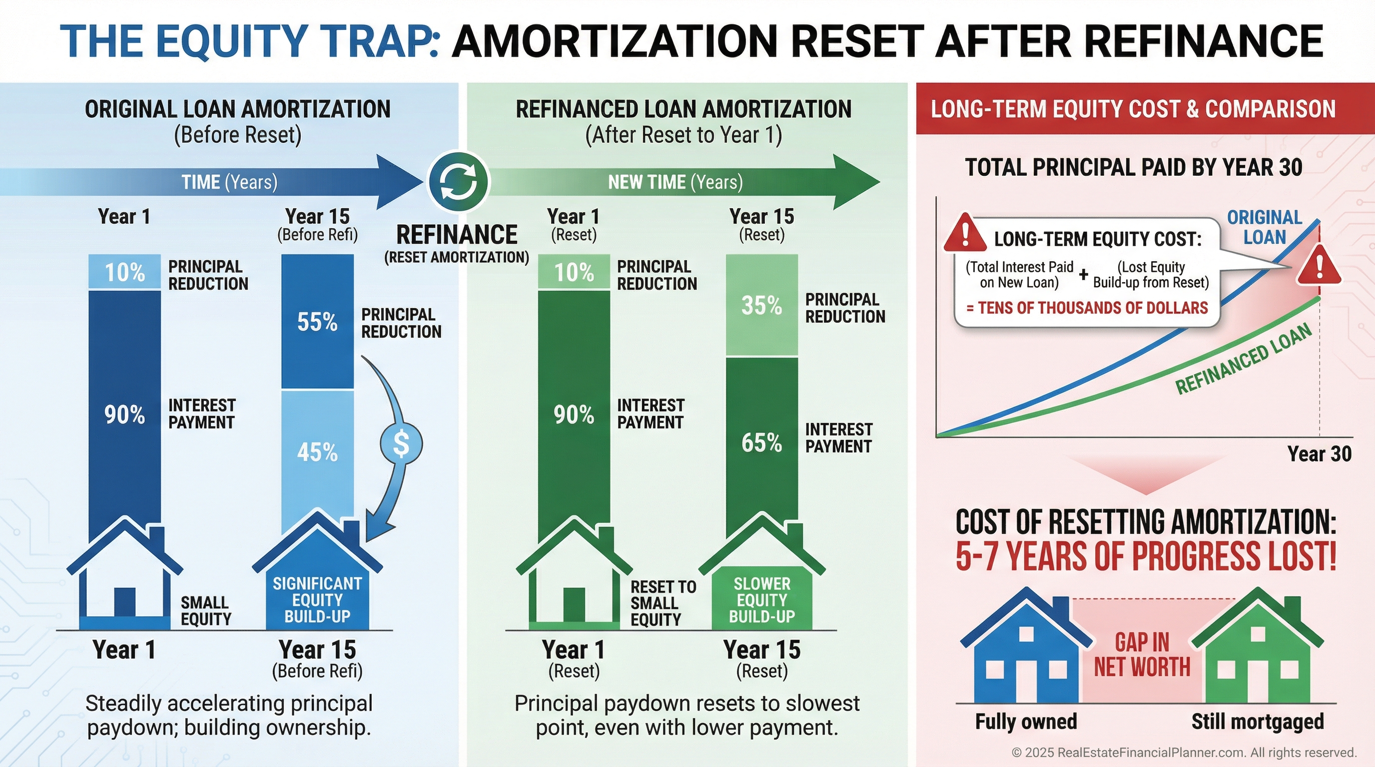 And here’s the part most lenders never highlight: resetting your amortization schedule after five, seven, or ten years wipes out years of progress. In many cases, the “smaller payment” ends up costing far more in the long run.