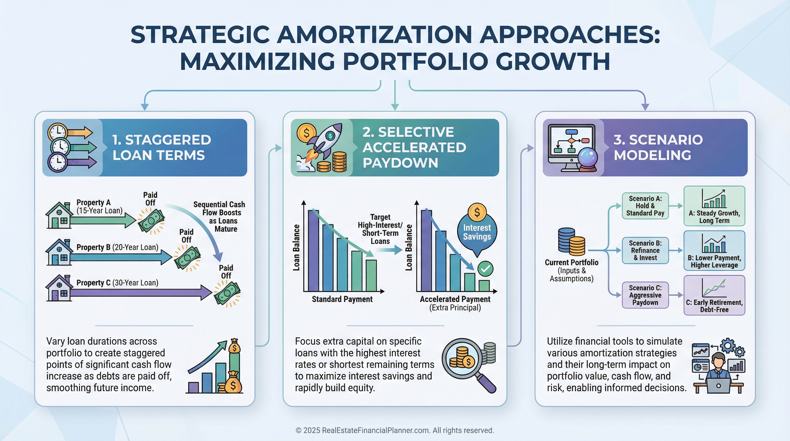 One strategy I often help investors model is staggered loan terms across a portfolio. Shorter terms on high-appreciation properties. Longer terms on cash-flow properties. Combined, those choices create steady equity “events” that fund future purchases.