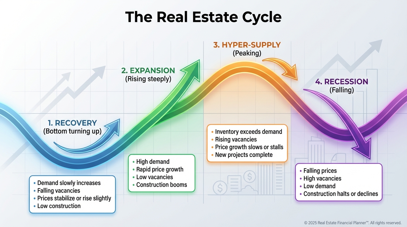 They tend to follow four distinct phases: Recovery, Expansion, Hyper-Supply, and Recession.