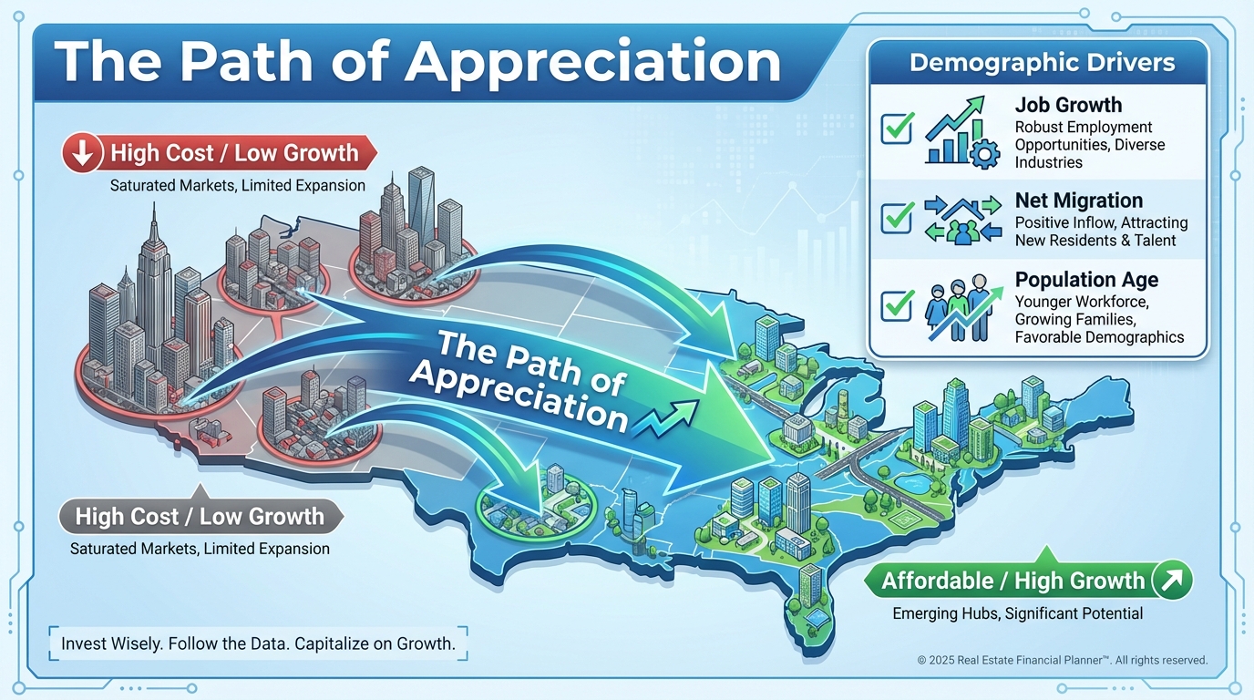 If a population is aging and shrinking, even a great property will struggle to appreciate.