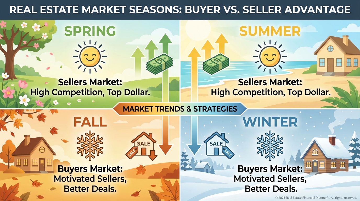 Fall/Winter - Low inventory, low competition, motivated sellers (Best for Buyers).