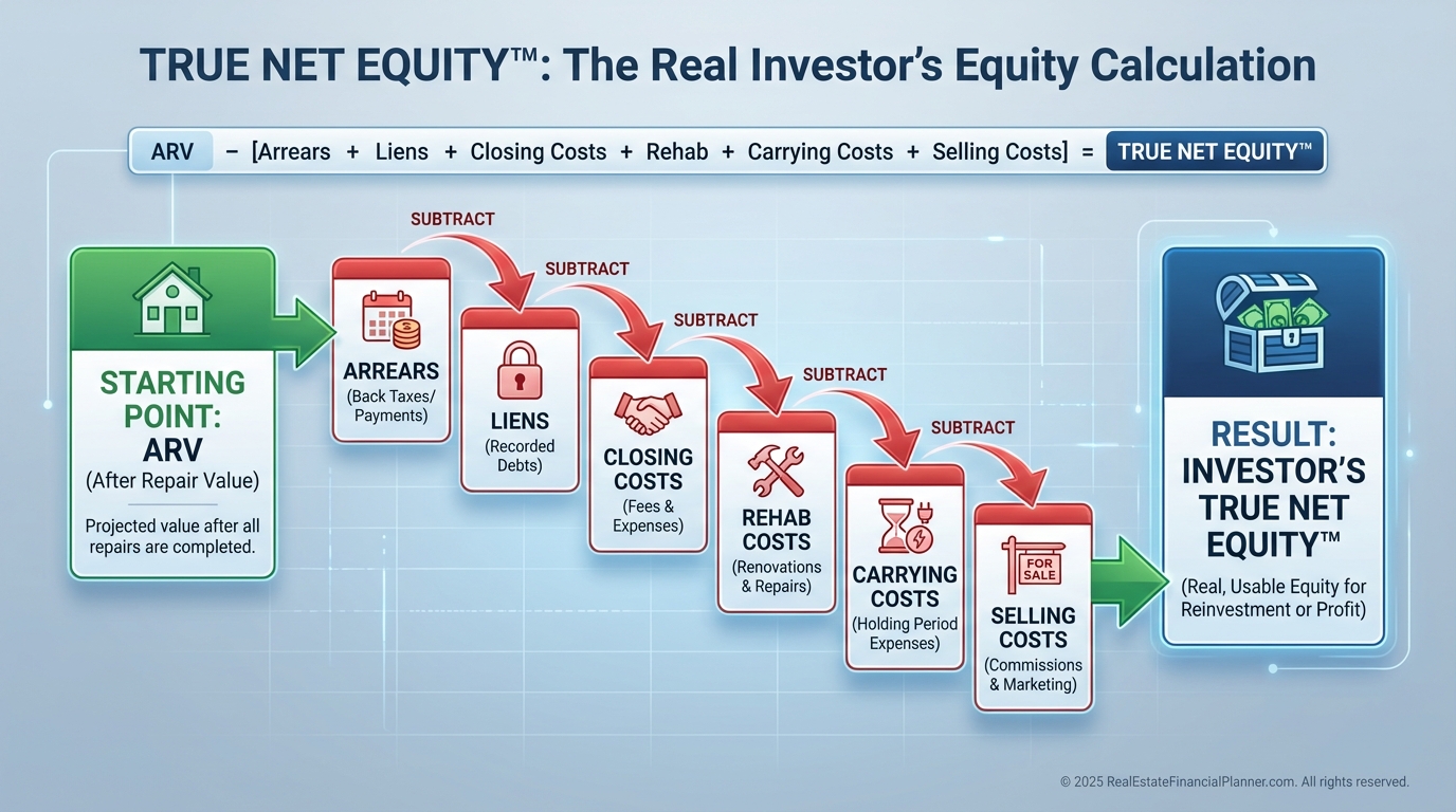 True Net Equity™ is what remains after purchase credits, arrears, closing costs, fees, repairs, and selling costs if you needed to exit.