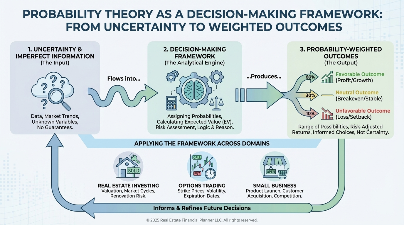 An overview of probability theory as a practical decision-making framework for real estate investors, stock and options traders, and small business owners who operate under uncertainty.