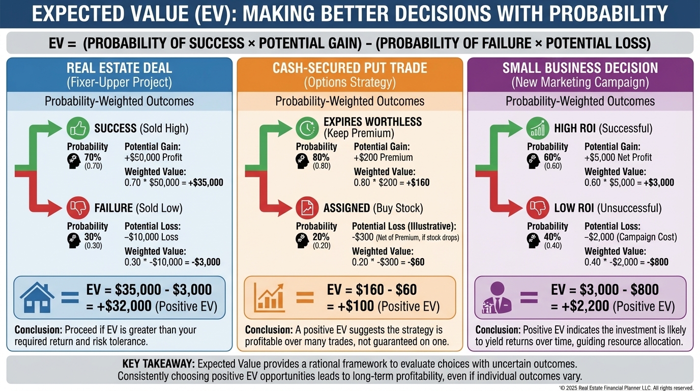 EV appears in deal analysis, renovation decisions, and negotiations when outcomes are asymmetric.